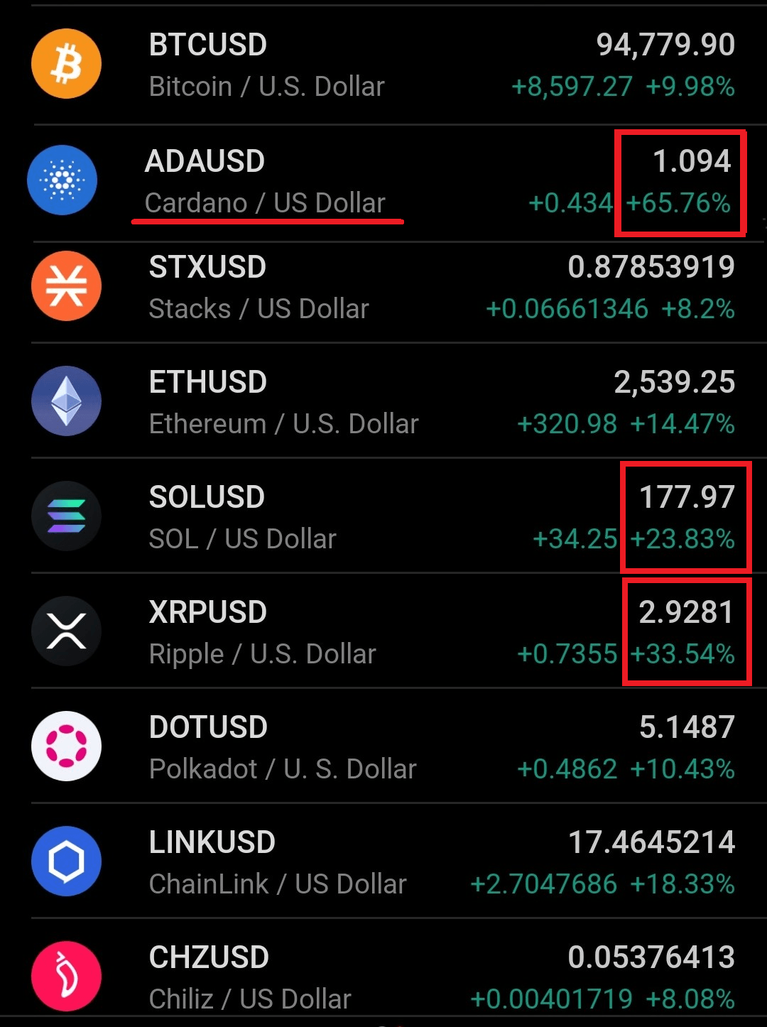 Print da tela do celular com os preços das criptomedas com valorizaçào diária em porcentagem.