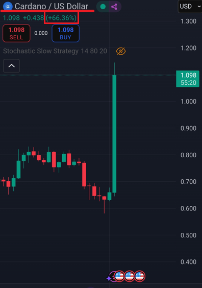 Print da tela do celular com o gráfico de candlestick da criptomeda ADA (Cardano) com valorização de 66,36%.
